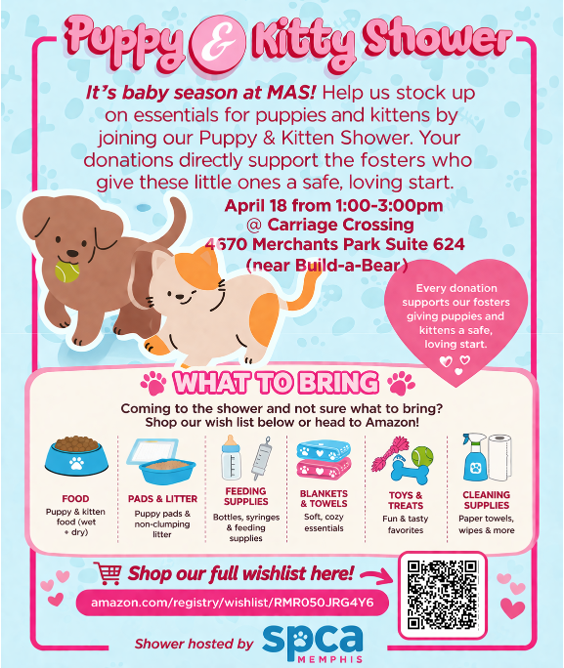 It’s baby season at MAS! Help us stock up on essentials for puppies and kittens by joining our Puppy & Kitten Shower.